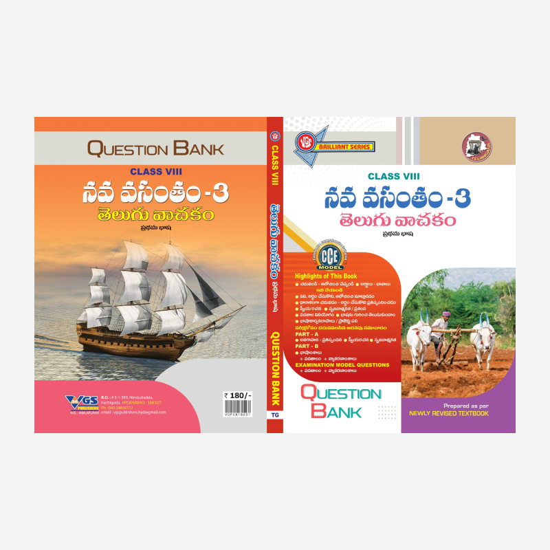 The TG 8th Class Telugu-Nava Vasantham-3( First Language) Question Bank-2026 is a comprehensive and student-friendly resource designed as per the latest Telangana State syllabus and exam guidelines. This book provides chapter-wise coverage of all topics from Nava Vasantham-3, ensuring complete preparation for the Class 8th Telugu examination.